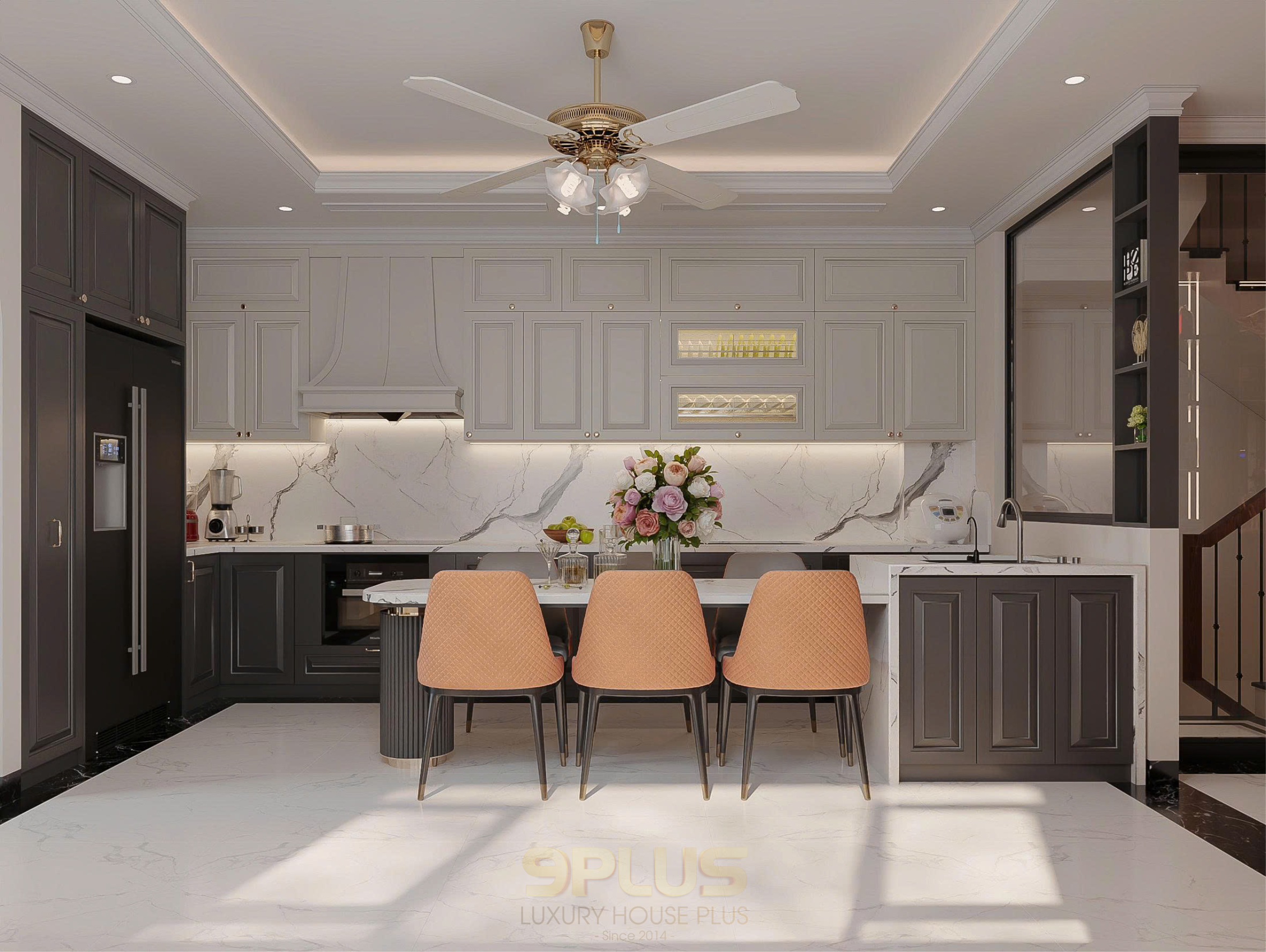 Với lối kiến trúc tân cổ điển cùng thiết kế xa hoa, sang trọng, không gian từ phòng khách đến phòng bếp của gia đình anh Nam chị Trang như bừng lên sức sống. Gam màu trung tính: kem, nâu, ghi … được kết hợp hài hòa trên những chất liệu nội thất khác nhau. Cửa sổ kính lớn được sử dụng để lấy tối đa ánh sáng ban ngày cũng như tạo sự lưu thông không khí khi cần thiết.