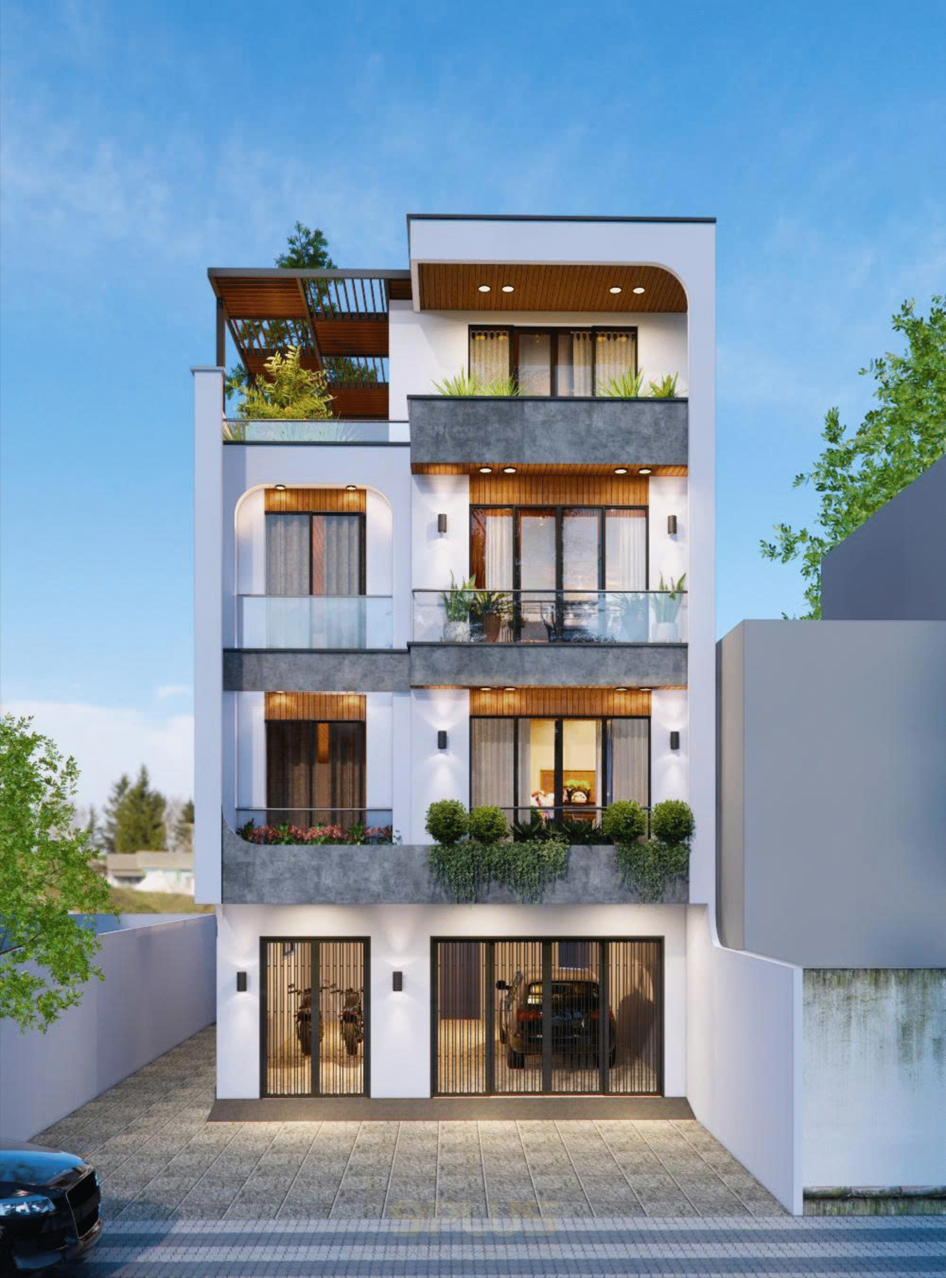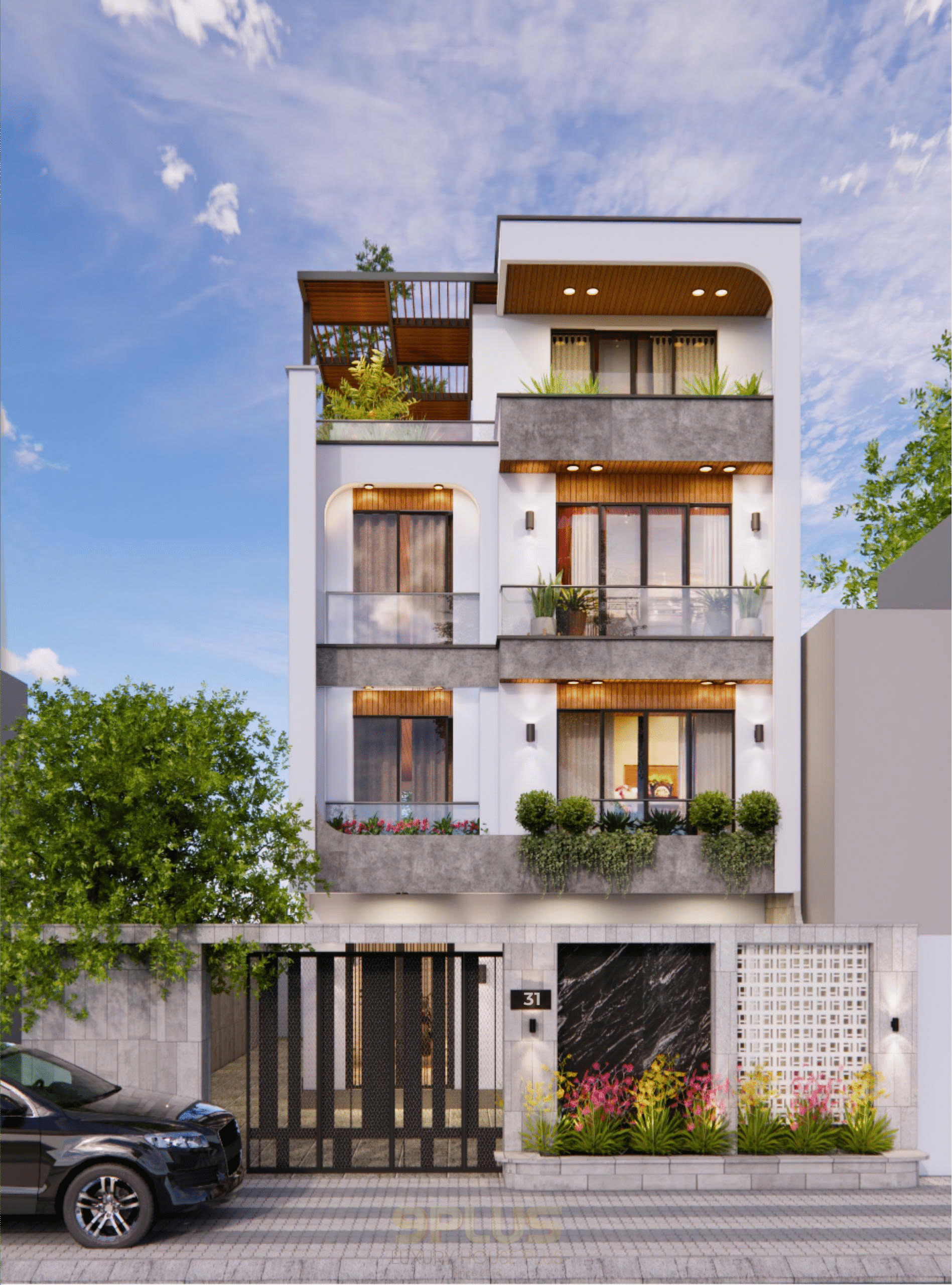 Thiết kế tối giản với hình khối vuông vức, mặt tiền thoáng rộng. Ban công kính và mảng xanh tầng 2, tầng 3 cùng sân thượng tạo cảm giác gần gũi thiên nhiên. Tông trắng – xám tinh tế, kết hợp cửa nhôm kính lớn giúp lấy sáng tối đa cho không gian bên trong.