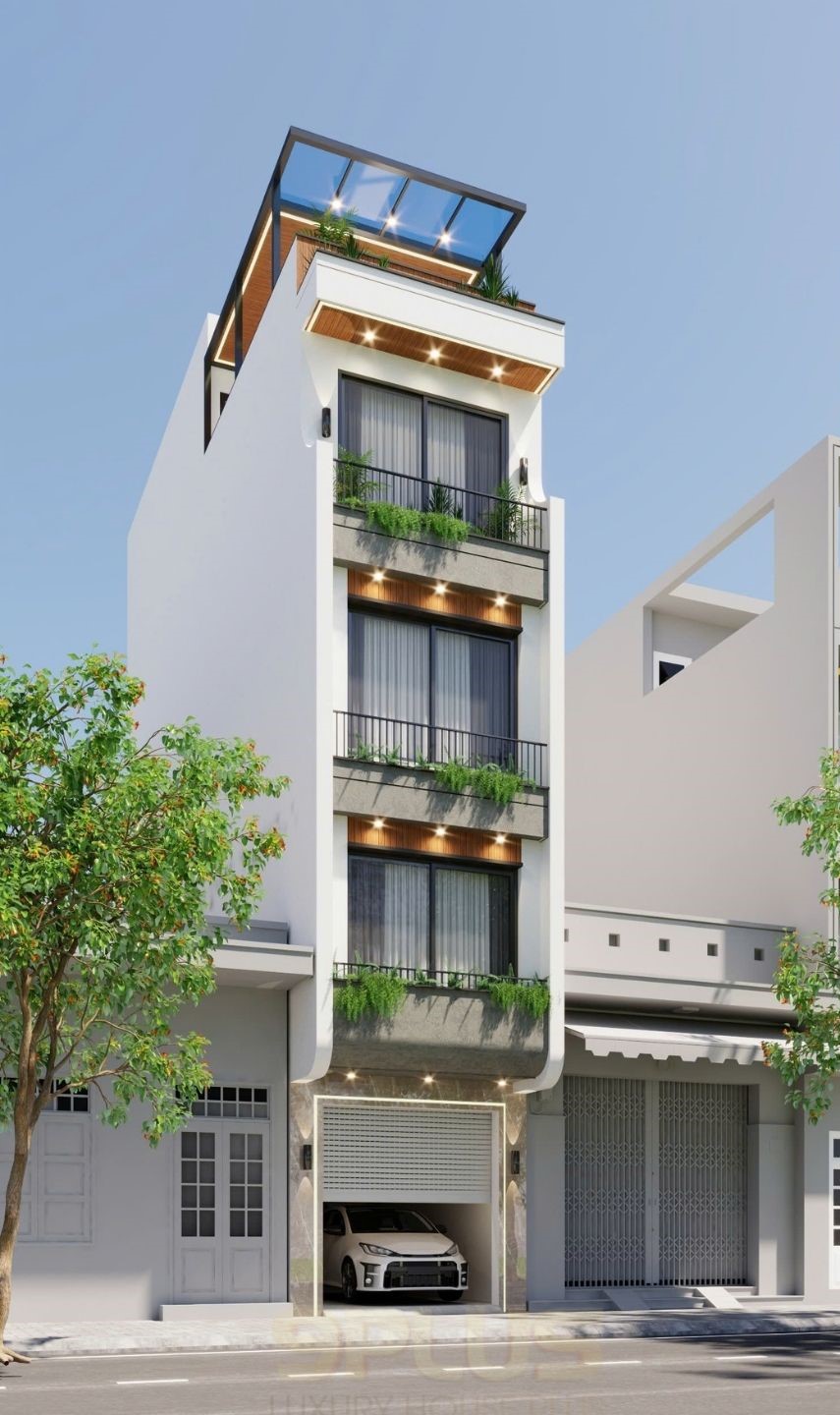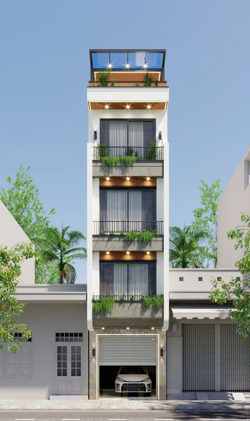 Tầng trệt bố trí gara ô tô gọn gàng, giải quyết bài toán thực tế của nhà phố. Các tầng trên ưu tiên không gian sinh hoạt và nghỉ ngơi, còn tầng trên cùng mở ra một khoảng sân thượng xanh – đúng kiểu “khoảng thở” cần có trong đô thị chật chội.