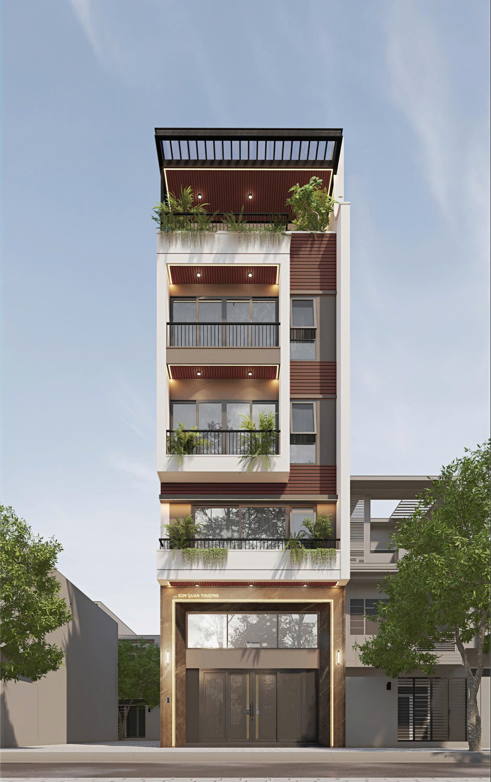Điểm nổi bật là các ban công được làm vừa đủ – không quá thò ra nhưng đủ để đặt cây xanh. Cây rủ xuống nhẹ, kết hợp lan can đen mảnh, tạo cảm giác mặt tiền “mềm” hơn. Cái hay là không tham cây – trồng vừa phải nên vẫn giữ được sự gọn gàng, đúng chất nhà phố đô thị.